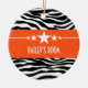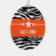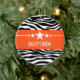 Trendy and modern Sassy Star Zebra Ornament featuring a chic black and white zebra print background and a bold orange border adorned with a fun star motif. This girly design may be customized with the personalized text of your choosing. Click "Customize It" to find more personalization options.