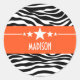 Trendy and modern Sassy Star Zebra Stickers featuring a chic black and white zebra print background and a bold orange border adorned with a fun star motif. This girly design may be customized with the personalized text of your choosing. Click "Customize It" to find more personalization options.
