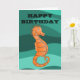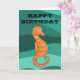 Happy birthday, orange seahorse in the swirling green ocean, customize this card to suit your needs and humour.