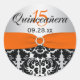 This 1.5" round orange, silver grey, and black damask Quinceanera 15 sticker or envelope seal has a PRINTED ribbon and a PRINTED diamond jewels buckle on it that matches the quinceanera party invitation shown below. Customize with your own text. Other shapes and sizes are also available. ***USE caution if you choose a different shape, as some text may get cut-off during printing. Everything will print as it appears on your monitor, and there is a large safety zone around the edge of the stickers, so it would probably be best if you contact me at the email address below if you prefer an alternate shape or need to add additional text. If you need any assistance, please email niteowlstudio@gmail.com for help.