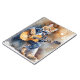 Watercolor splash art of an orange tabby cat playing guitar.