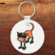 A keychain featuring an cartoon orange tabby wearing 2 pairs of roller-skates, black and white stripey socks and a safety helmet.