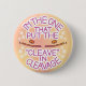 Image description: an orange pin that reads, "I'm the one that put the cleave in cleavage" on the top and bottom. Between the text are double incision top surgery and drain scars. On either side are light stars.