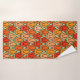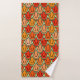 This towel set has an orange washcloth, a darker orange hand towel, and a bath towel with an art deco design of tulips from pentagons and trapezoids in different shades of orange.
