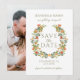 Experience sophistication with this refined and contemporary rustic Save the Date photo invitation. Enhanced by a delicate wreath of orange watercolor flower blooms whreath, this elegant design offers further personalization by featuring a couple's photo on the back.