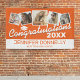 Personalized graduate school colours party banner featuring an orange background that can be changed to any colour, 5 photos of the student, a graduation cap, and a congratulations template that is easy to personalize.