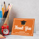 This modern orange and white custom graduation thank you card features classy handwritten thanks above your high school or college name for the class of 2025. Customize with your name under the black grad cap for great personalized graduate thank you cards.