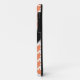 Personalized iPhone 5 case designed with an orange and white houndstooth pattern and custom printed with your name or text in white over a diagonal black stripe.