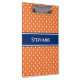 Personalized orange and white polka dot pattern with royal blue accent clipboard. Small white polka dots on orange and in the middle there is a royal blue band to put your custom name in.