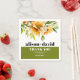 This elegant fall wedding paper napkin showcases a beautiful rhododendron branch adorned with delicate orange yellow lowers and greenery at the upper part. The couple's names are prominently displayed in bold typography, adding a personal touch to the design. A heartfelt message of 'Thank You' is also included, expressing gratitude to the guests. Completing the look, a stylish olive green band gracefully adorns the bottom of the napkin, adding a touch of sophistication to any wedding celebration.