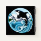 An orca jumping out of the ocean with water all around. Mountains and blue sky all around the killer whale drawn in an art nouveau style.