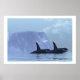 Two killer whales swim near some icebergs.