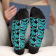 Add an aquatic touch to your outfit with these illustrated socks that features illustrations of orcas or killer whales in black and white set against a teal blue ocean waves background.