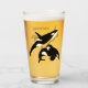 Create a personalized gift for someone who loves whales and other ocean animals. This pint glass features illustrations of orcas or killer whales in black and white with graphics on both the front and back of the glass. The front has a spot to add a name in bold black lettering.