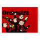 Red background with thin black outlines of concentric circles behind a group of musicians playing and the word "Orchestra" above.