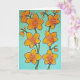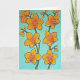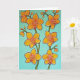 Stylized painting of orange sunset coloured orchids on a striking blue/azure background.