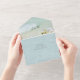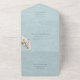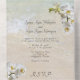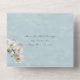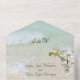 Plage à thème, tropical, tout-en-un faire-part de mariage avec carte de réponse détachable. Des orchidées blanches décorent l'espace invitation. Des initiales peuvent être ajoutées en haut, sous le rabat. L'image arrière - plan est le sable de plage avec des vagues qui descendent au bord de la mer au sommet des cartes. Trois modèles d'adresse sont à votre disposition à l'extérieur. Si une enveloppe extérieure est utilisée, supprimez le texte d'adresse inutile. Un cachet peut être ajouté à la carte de réponse afin que les clients puissent simplement remplir les noms et les informations de réponse et les déposer dans le courrier. La réponse au menu peut être changée en un simple "assistera" et "n'assistera pas". Bien que l'exemple de texte soit destiné à un mariage, le modèle de texte principal de l'invitation est sous forme de paragraphe et peut être facilement modifié pour un mariage ou un autre événement côtier. Le graphique extérieur est bleu-vert.
