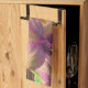 The orchids are blooming again in the garden, in the original photograph by ZoeSPEAK on this Kitchen Towel. The flowers, emerging from a curving green stem, have purple centres which blend into yellow at the tips of the petals. The natural wood background sets off the sculptural shapes and colours.