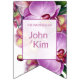 Orchids provide an ornamental backdrop for this wedding bunting banner flags. Great for warm weather events, weddings, anniversaries, outdoors, indoors. Use to complement floral wedding event themes, including tropical themes. Flags 3-6 spell "JUST" and flags 8-14 spell "MARRIED." Use the template to personalize.