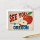 A charming Oregon vintage travel postcard featuring a lovely red apple, along with fun retro style text that says, "See you in Oregon"