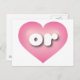 This postcard features a pink heart with a white-washed centre containing the bold, white, rounded lower case letters or, a playful abbreviation for Oregon, the beaver state. The reverse side of the card is blank, awaiting your handwritten sentiments or customized text.