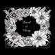 Une illustration en noir et blanc présente un cadre floral entourant les noms "David & Mary". Le cadre est composé de diverses fleurs et feuillages, y compris des marguerites et d'autres fleurs avec des détails complexes de pétales et de feuilles. Les fleurs sont disposées selon un motif circulaire, créant un effet de couronne autour des noms. Les noms "David & Mary" sont écrits dans une police élégante et cursive, centrés dans le cadre floral. Le fond est noir uni, ce qui fait ressortir le cadre floral blanc et le texte. L'illustration est enfermée dans une bordure carrée, ajoutant un élément géométrique au design. Le style de l'illustration est détaillé et précis, ressemblant à un dessin à la plume et à l'encre.