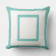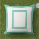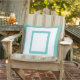 L'oreiller extérieur est présenté dans un design aqua et blanc moderne.