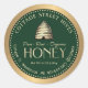 A vintage gold skep on a green background with pale gold text and gold gradient border. "Honey" is written with an 'embossed' font in a light-coloured metallic gold gradient. Add your apiary name, honey net weight, location and contact info. And --Happy Beekeeping!