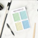 Post-it notepads, personalized with your name, for to do lists and daily organizing with four categories: asap, soon, later, whenever. Green, turquoise, yellow, and blue. A practical, clean look.