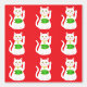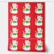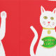 This awesome patterned wallpaper features a graphic design image of a lucky oriental white waving cat. The cat has beautiful gold eyes and is wearing a gold medallion on the collar around its neck. The cat has pink ears and whiskers. This cute little kitty is holding a golden token with green jade inlay and a message in golden text that says "Good Luck".
