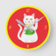 This awesome wall clock features a graphic design image of a lucky oriental white waving cat. The cat has beautiful gold eyes and is wearing a gold medallion on the collar around its neck. The cat has pink ears and whiskers. This cute little kitty is holding a golden token with green jade inlay and a message in golden text that says "Good Luck".