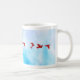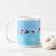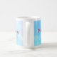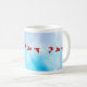 mug with a blue watercolor background and red origami birds. The mug is cylindrical in shape with a white handle and a white interior. The background is a light blue watercolor wash. There are six red origami birds scattered across the background. The mug is on a white marble surface.