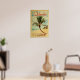 A uniquely retro mid-century modern Orlando Florida art print in vintage travel poster style. It features a curved palm tree on sandy beach with ocean under a blue cloudy sky.