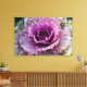 This stretched canvas features a closeup of a purple and white ornamental kale. Ornamental kale and cabbage make great borders and provide fall and winter colours to gardens and landscapes.