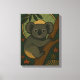 This vibrant wildlife art print features a stylized koala perched calmly at the heart of a radiant, mandala-like composition. Framed by a circular sunburst and surrounded by lush leaves, flowers, and geometric patterns in warm greens, oranges, and yellows, the koala’s expressive gaze and textured fur bring a sense of quiet strength and natural harmony.