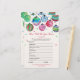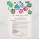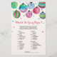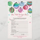 This ornaments "how well do you know the bride" game is perfect for a bridal shower in December. The front of the game card features "how well do you know the bride", and the back of the card features "what's in your purse". The design features red curly script text with ornaments dangling at the top of the game card, and colourful red green and blue confetti falling down towards the text. Personalize the front of the card with the name of the bride and bridal shower date.