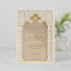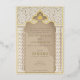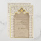 This beautifully designed wedding invitation card exudes opulence and tradition with its architectural lace design and foil accents. The front of the invitation displays a stunningly intricate pattern that draws inspiration from the grand arches and columns of Islamic architecture, brought to life in a rich palette of gold, cream, and ivory. The back complements the front with its own detailed artwork, harmonizing to create an invitation that is not only a prelude to the wedding but also a cherished keepsake. This card is perfect for couples who wish to honour their heritage while making a luxurious statement.