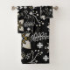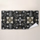 Ornate black and white floral pattern with gold accents. Central symmetrical flower surrounded by leaf motifs and intricate branches. Elegant, decorative design.