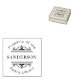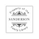 This ornate book stamp features a decorative name plate where you can add your last name. The text "Property of the" curves around the top, while "Family Library" curves around the bottom. The overall effect reads "Property of the [Custom Last Name] Family Library".