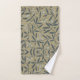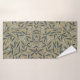 Ornate floral pattern with dark blue vines and leaves on a beige background. White circular flowers with gold accents add elegance and contrast.