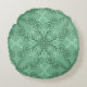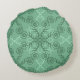 Round throw pillow with a detailed and intricate pattern of leaves and swirls in three shades of green. Ornate symmetrical design in cool soothing greens.