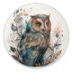 An ornate watercolor owl framed by leaves.