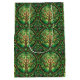 Ornate shopping bag featuring a repeating pattern of lush green trees with vibrant red berries on a dark background, creating an elegant and rich design.