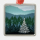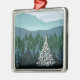 Le pin solitaire BLEU de NOËL A d'ARÊTE avec les lumières blanches se tient dans une forêt avec des montagnes à l'arrière-plan.
