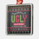 "Prenez-vous un sale pull Noël." Aidez à décorer votre arbre dans le "style" avec cet ornement en métal argent de qualité exceptionnelle et amusant! Motif nordique d'arbres caprices, rennes, ornements, ainsi que la typographie "pull" ludique en rouge, vert et bleu aqua, superposent un arrière - plan de tableau noir. Sentez la chaleur et la joie de la saison des Fêtes chaque fois que vous utilisez raccrocher ce ornement de Noël amusant, simple, moderne, personnalisé. Choisissez parmi différentes formes. Faites de ce Noël un souvenir ! En utilisant les modèles faciles d'utilisation, tapez votre nom de famille et votre année, et vous pouvez personnaliser sans effort cet ornement métal précieux. S'il vous plaît, envoyez-moi un message avec toute question ou demande.