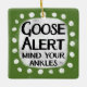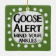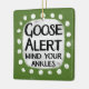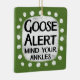 Un dessin typographique irrévérencieusement bizarre qui dit "Goose Alert, Mind Your Ankles". Il présente du texte noir et rouge sur un rectangle blanc avec des points blancs amusants et amusants qui l'entourent, le tout sur un arrière - plan gris.