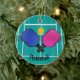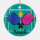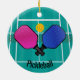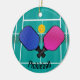 Pickleball Design Ornament avec du texte personnalisable des deux côtés. Le Pickleball est un sport de raquette et de pagaie qui a été créé en combinant des éléments de plusieurs autres sports de raquette. Deux ou quatre joueurs utilisent des pagaies solides pour frapper une boule de polymère perforée (comme une boule de torsion) sur un filet.