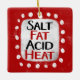 "Salt Fat Acid Heat" est un design de texte amusant avec une forme d'accent blanc entourée de points blancs texturés.