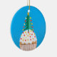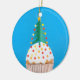Un ornement de Noël avec un cupcake de chaque côté. Le givre blanc est surmonté d'un sapin de Noël décoré et provient d'un collage en papier peint à la main par Judy Adamson. Des tasses à café et des cartes de Noël avec ce design sont également disponibles.