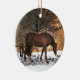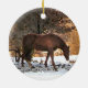 Cet ornement de vacances comporte un beau cheval brun d'or passant en revue pour les pommes tombées sous la neige, contre un contexte des collines nues. Ceci semblera beau pendre de votre arbre de Noël !